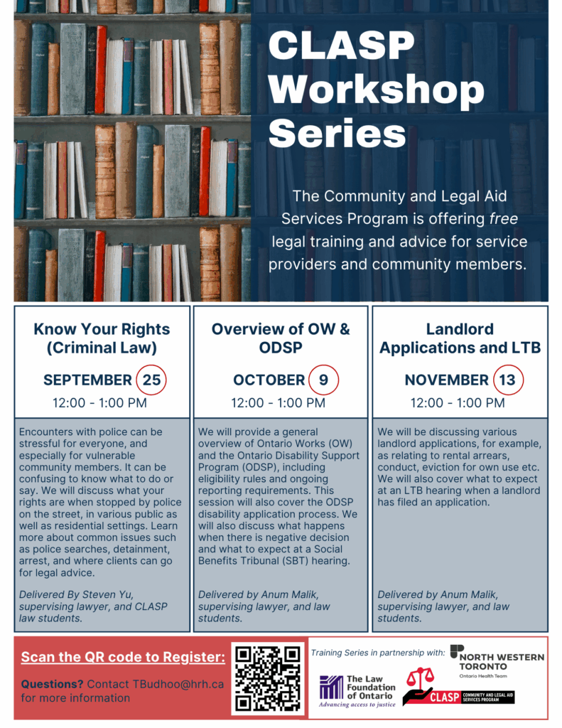 In partnership with the Community and Legal Aid Services Program (CLASP) at York University, the OHT will be co-hosting a series of legal aid workshops to equip service providers with practical legal knowledge that can be applied in support of the communities we serve.